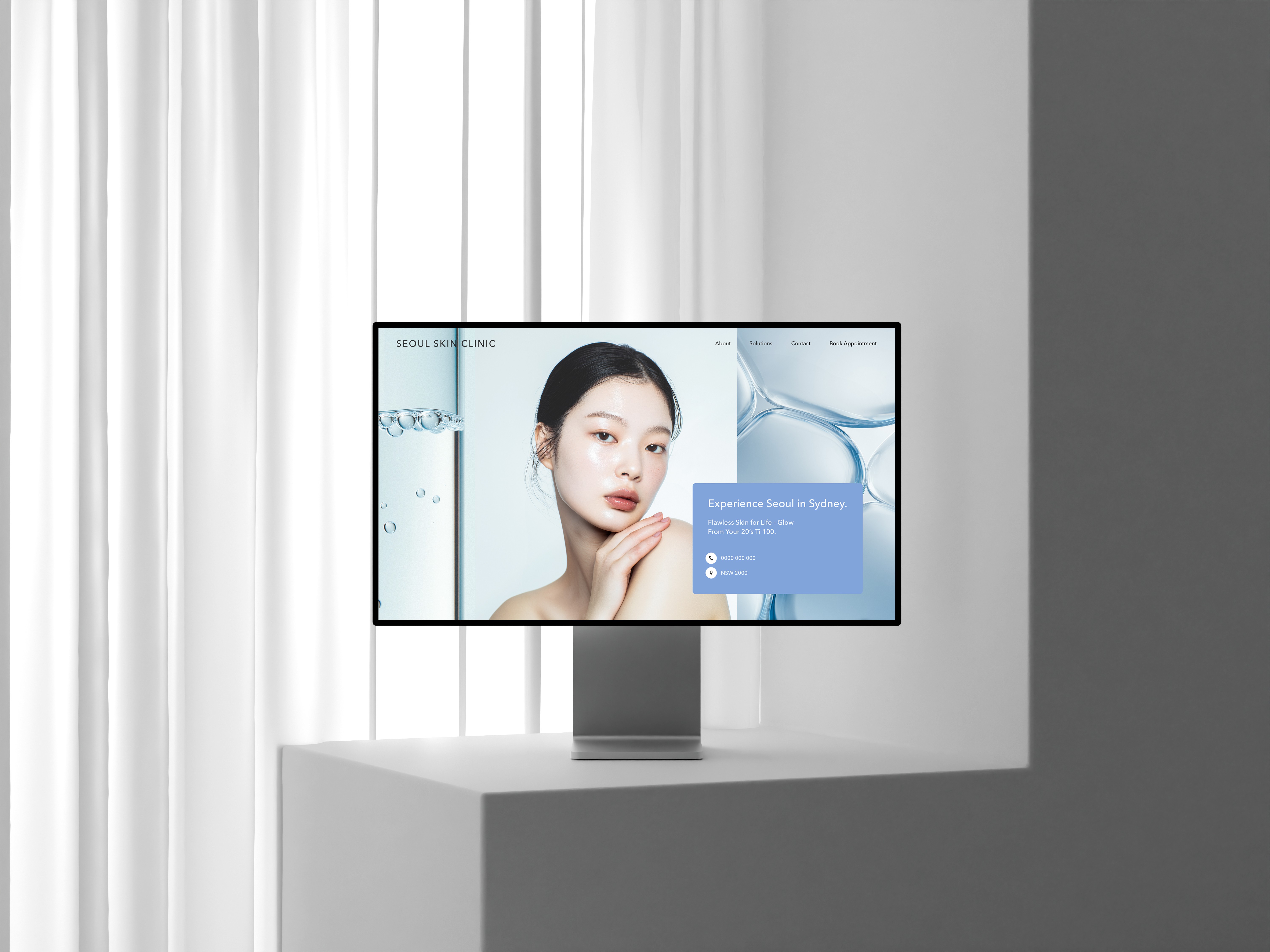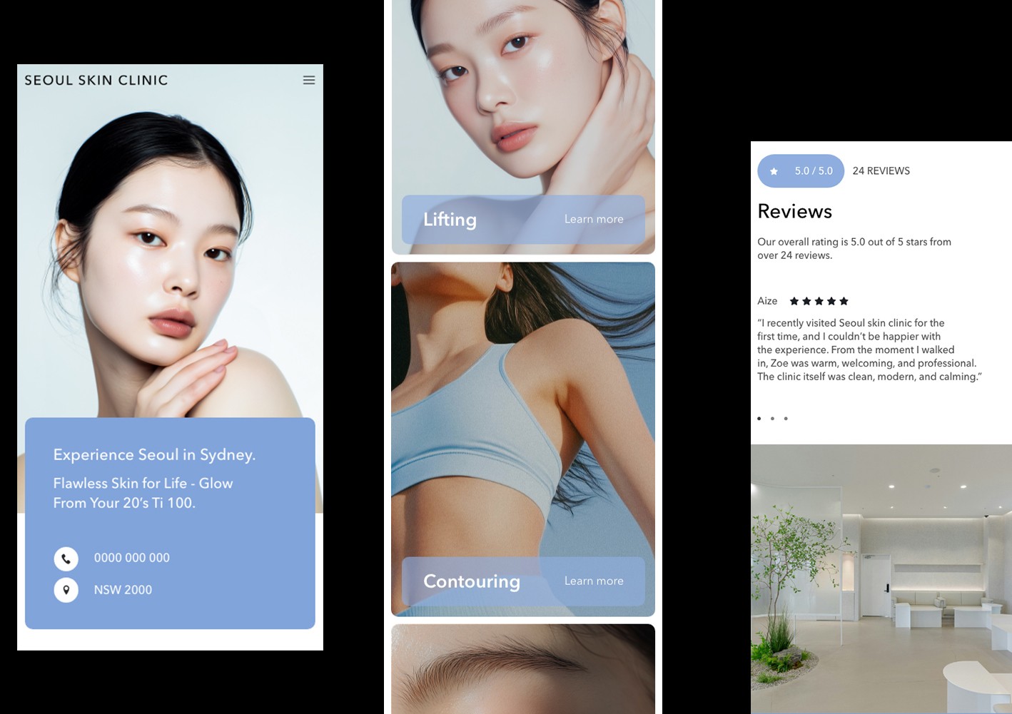 The design for Seoul Skin Clinic centers on trust and cleanliness, using pastel tones and a thin gothic-style logo to create a refined and calm impression. By removing unnecessary elements, the minimal layout conveys both professionalism and reassurance through a clean, well-balanced brand experience.
